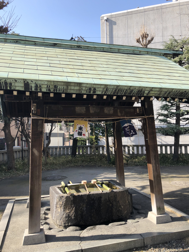 赤羽駅から線路沿いに歩き高架の先の鳥居をくぐると左手が石段でかなり急坂になっている。上りきった左手に手水舎、正面が拝殿で左右に境内社が鎮座する。